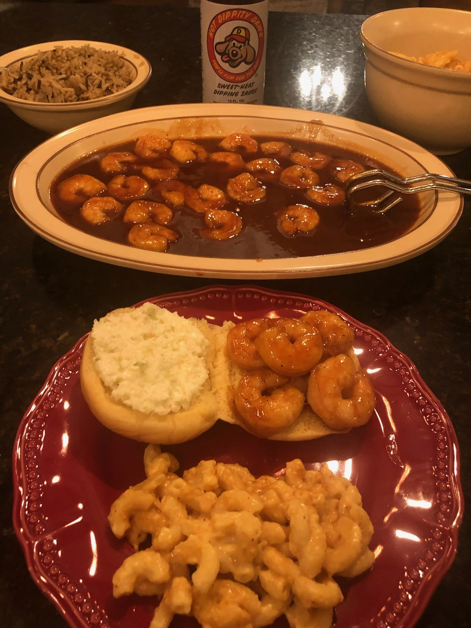 Sautee your shrimp in butter, then add Dippity’s “Sweet-Heat” sauce (Your Choice) to your skillet until the sauce has caramelized on the shrimp. Then cover your corn pudding or grits with your shrimp